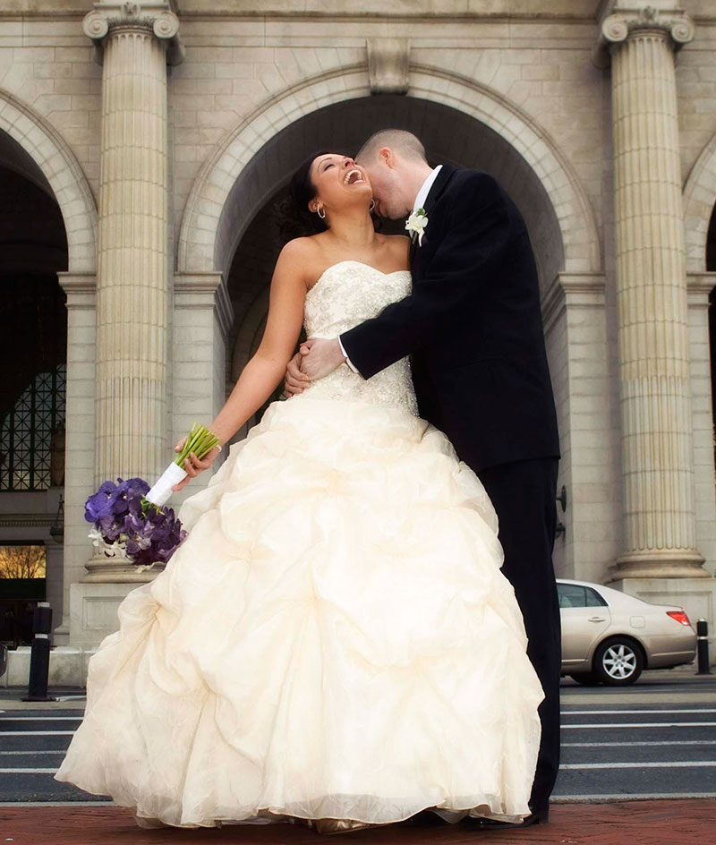 Colleen and Brad were married at the Cathedral of St. Matthew in Washington DC, an absolutely gorgeous and stately place of worship. At their reception, they made their entrance down the curved grand staircase into the large Atrium that was the sought after Galleria at L’Enfant Plaza. Marble floors, wall to wall windows, glass ceiling, fuchsia lighting and gold accents made an unbelievably wonderful picture. The guests enjoyed a lobster and steak dinner, then danced the night away under the stars. Really sweet couple! And now they have a beautiful little baby girl. Love you both, Colleen and Brad! Colleen and Brad were married at the Cathedral of St. Matthew in Washington DC, an absolutely gorgeous and stately place of worship. At their reception, they made their entrance down the curved grand staircase into the large Atrium that was the sought after Galleria at L’Enfant Plaza.