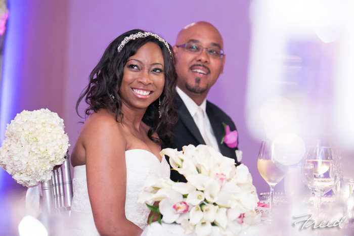 Jennifer and Cliff! Wonderful couple, and a very busy couple! Jennifer had received a promotion on her job and couldn’t take much time from work to plan a wedding, so a lot of the planning was done with the help of her mother, who was in Texas. I had a great time working with both of them. And Cliff was the most easy-going, awesome groom! Loved working with him too, and it was so obvious that all he wanted was a happy bride. Whatever she wanted was fine with him! The ceremony was on the outdoor Astor Terrace at the five-star and very elegant St. Regis Hotel, located just minutes from the White House. The weather report had called for rain, but God held back the rain and she made her entrance under a beautiful sky and to the music of live strings. Hydrangeas and roses encircled them as they pledged their lifelong love and devotion to each other. The Ballroom reception was a sea of white flowers, candles and crystal. They chose fuchsia linen, white lounge furniture with fuchsia accented pillows, and tied it all together with fuchsia lighting and a shining white dance floor. Hotel guests couldn’t stay away when we were setting it all up. It was a joy working with Jennifer and Cliff, and I certainly pray for a long and happy marriage for them! Jennifer and Cliff! Wonderful couple, and a very busy couple! Jennifer had received a promotion on her job and couldn’t take much time from work to plan a wedding, so a lot of the planning was done with the help of her mother, who was in Texas. I had a great time working with both of them. And Cliff was the most easy-going, awesome groom! Loved working with him too, and it was so obvious that all he wanted was a happy bride. Whatever she wanted was fine with him!