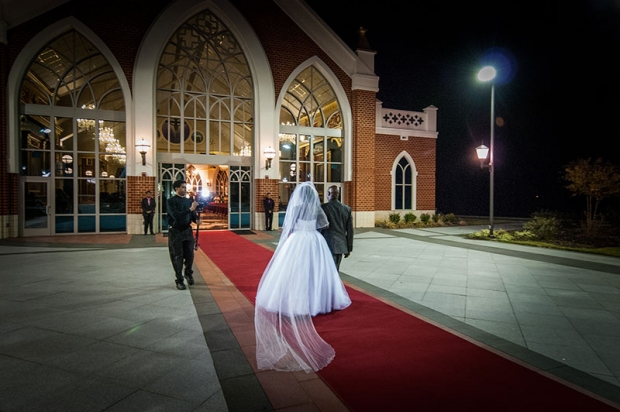 Samantha arrived with her father in a white vintage Rolls Royce, and walked down the aisle of a gorgeous chapel with walls of glass and beautiful, large crystal chandeliers. Brandon could hardly contain himself at the approaching vision. They said "I do" before blue lighting, white roses and fluffy hydrangeas. The reception was quite the change! The reception was dressed in purple and fuchsia, with submerged orchids and floating candles gracing the tables. You can see from the pictures that they are very much in love. It was a truly romantic wedding. Samantha was so happy with how well we took care of her that after the wedding she actually joined our team, and is now a member of Covenant Weddings and Occasions!Samantha arrived with her father in a white vintage Rolls Royce, and walked down the aisle of a gorgeous chapel with walls of glass and beautiful, large crystal chandeliers. Brandon could hardly contain himself at the approaching vision. They said "I do" before blue lighting, white roses and fluffy hydrangeas.